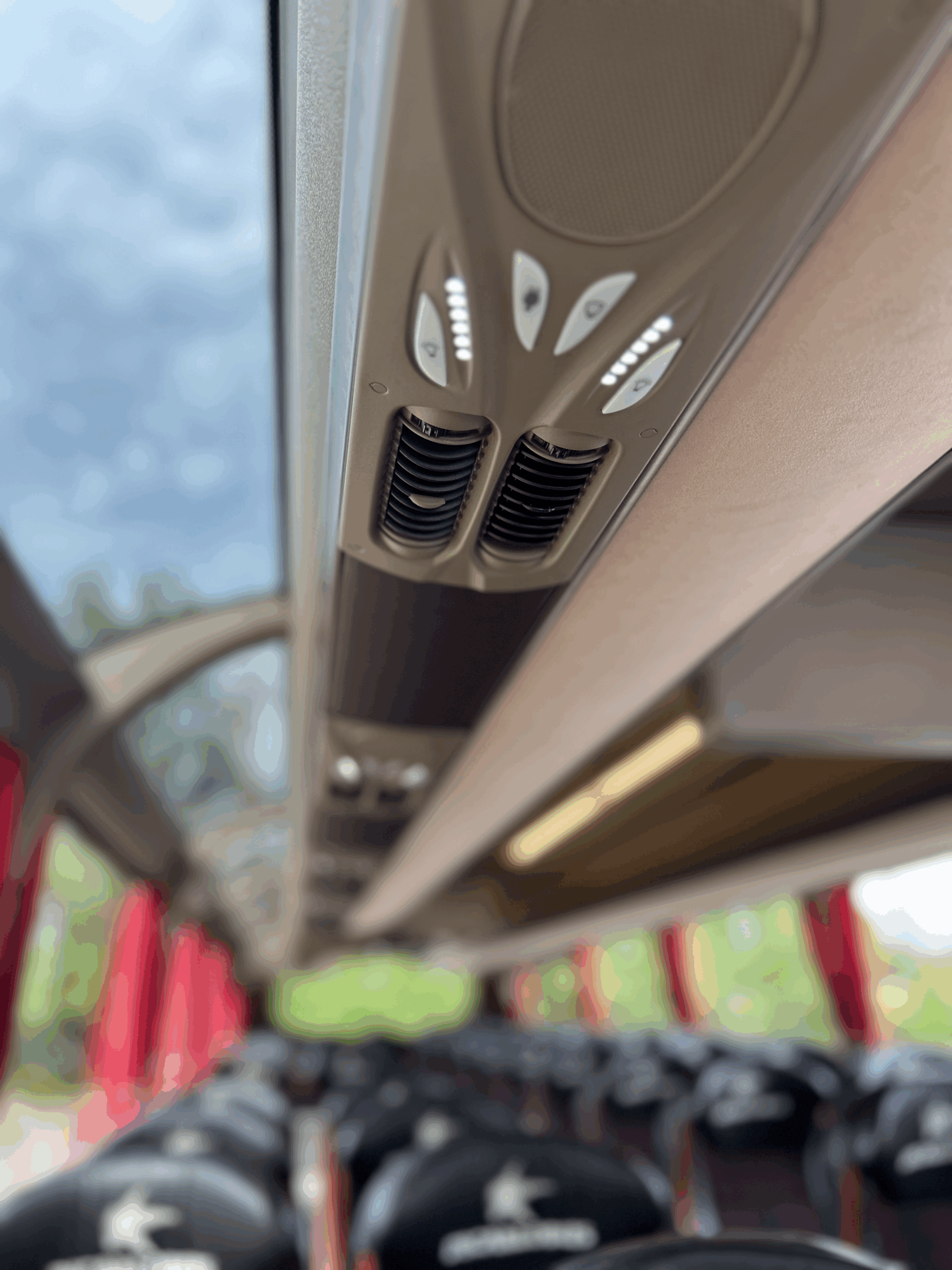 A bordo non mancano luci di lettura individuali, prese di ricarica a 220 V in ogni postazione, frigo bar e impianto audio-video per un intrattenimento di qualità. Su richiesta preventiva è disponibile il WC, mentre gli ultimi sistemi di assistenza alla guida assicurano viaggi sempre più sicuri e sereni.